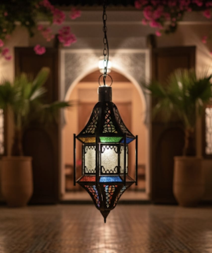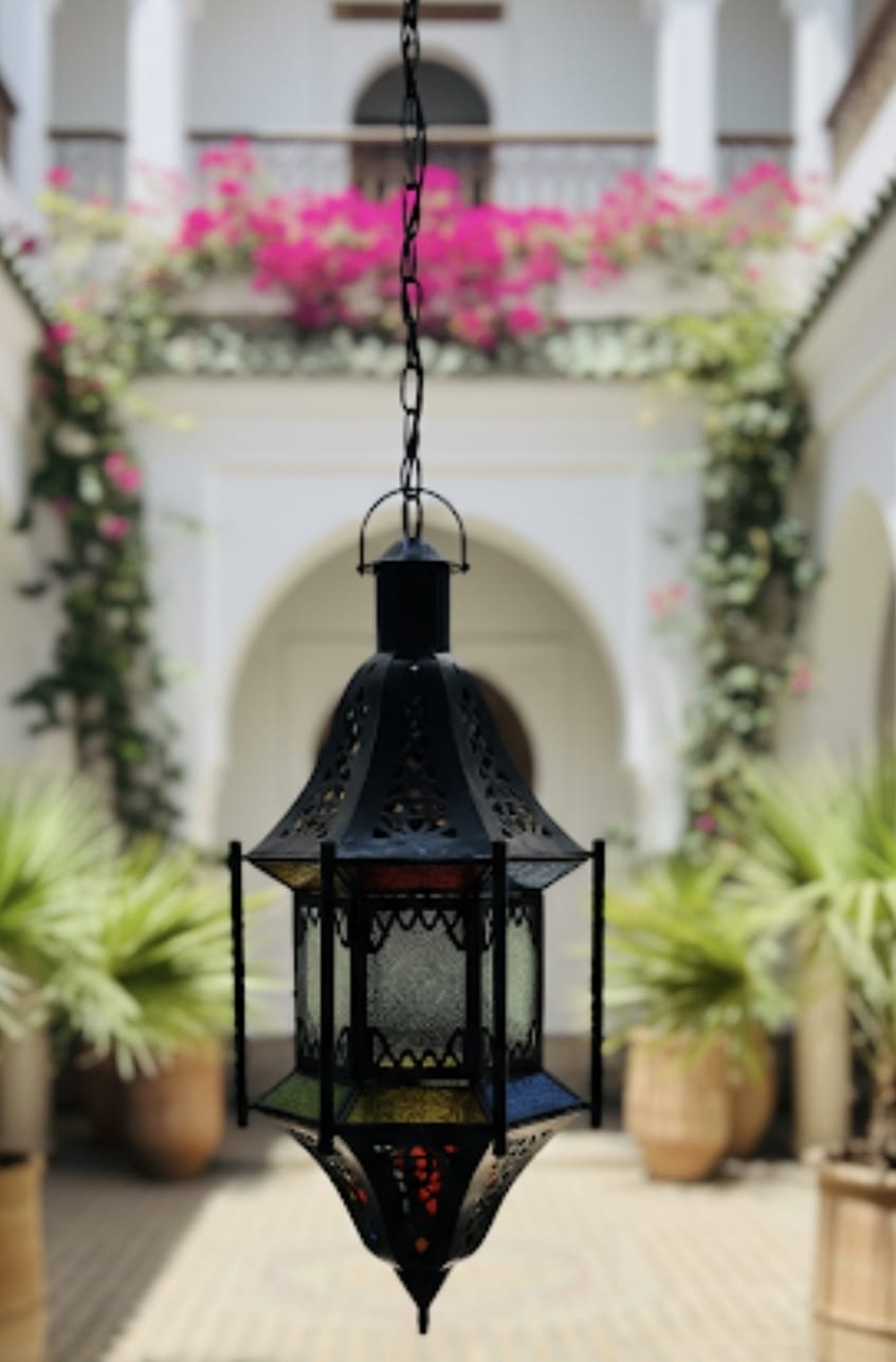 - Auténtica Artesanía Marroquí: Cada lámpara es hecha a mano por expertos artesanos, lo que garantiza una pieza única llena de carácter. Los paneles de vidrio de colores (azul, rojo, fucsia, verde y naranja) están cuidadosamente ensamblados en una estructura metálica finamente calada, creando un espectáculo de luz y sombra al encenderse.