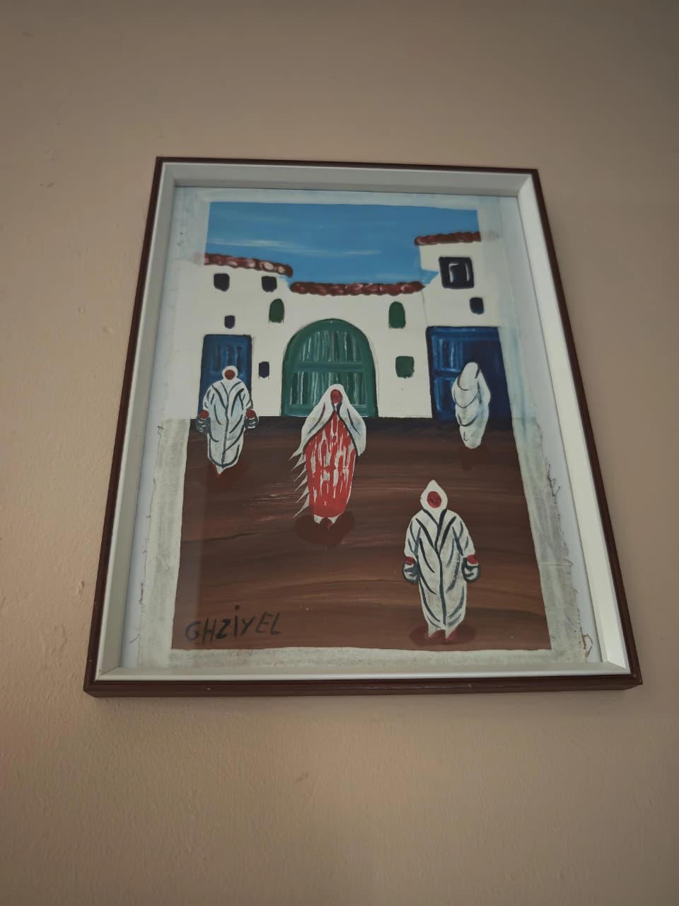 Un paseo por un bullicioso mercado, capturado con pinceladas sueltas y colores vivos. Tres figuras en túnicas blancas y una en un distintivo rojo se mueven a través de una plaza, evocando la energía y la vida de un zoco marroquí. La arquitectura blanca y los detalles en azul crean un hermoso contraste con el cielo azul claro. Una pieza llena de vida y movimiento, perfecta para espacios que celebran el viaje y la cultura. Ideal para oficinas o áreas de estudio.