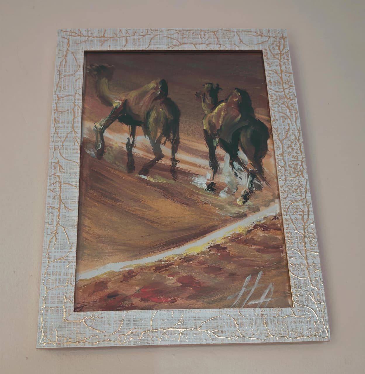 Esta pintura dinámica captura un momento de vida en el desierto. Dos camellos se acercan al agua, sus reflejos borrosos en la superficie crean una sensación de movimiento y vida. Los tonos cálidos y las texturas arenosas del paisaje evocan el calor del desierto. Una pieza con energía y realismo, perfecta para amantes de la vida salvaje y la naturaleza. Ideal para un estudio o un espacio con temática de viajes.